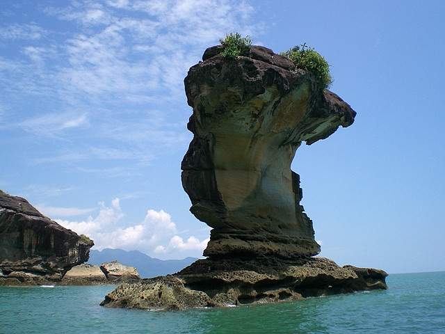 Национальный парк Бако расположен в штате Саравак, остров Борнео, Восточная Малайзия. Миллионы лет эрозии песчаника создали побережье из крутых скал, живописных видов и песчаных бухт. На фотографии зафиксирована скала Pandan Kecil, которая напоминает голову кобры, высунувшуюся из воды.
