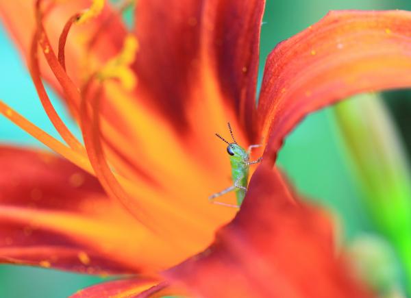 Крошечный кузнечик вылезает из цветка, чтобы напомнить нам о чудесах природы.