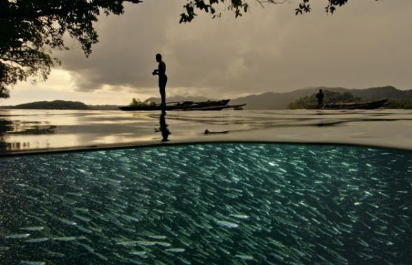 Фотограф Дэвид Дубиле погрузил свой объектив под воду ровно на половину, для того, чтоб показать удивительный образ пролива Дамир. На вершине можно увидеть Зеркальную поверхность воды, а под ней просто кишит рыба.