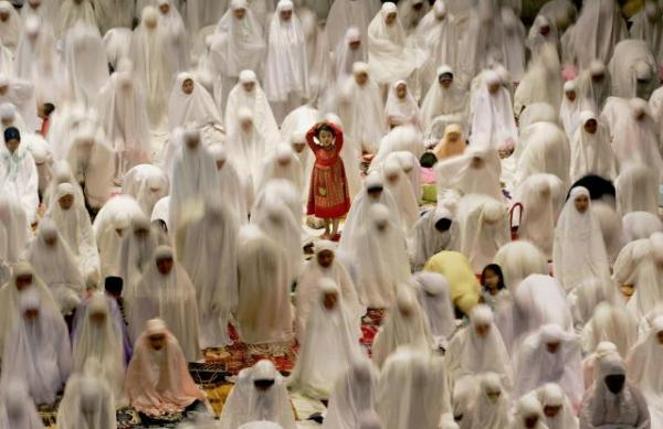 Красное платье этой маленькой девочки является всплеск яркого цвета среди белых одежд женщин в мечети во время Рамадана.