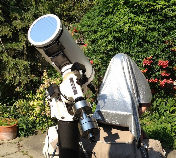 Чтобы сделать запись фотографий солнца, Алан использует фильтр, который передает только узкую часть темно-красного конца видимого спектра. Названный фильтром Hydrogen Alpha, он присоединен к переднему концу маленького (3.75 ) телескопа. В результате получается 450 мм f5 телеобъектив, а используемая камера является индустриальной веб-камерой и может делать фотографии со скоростью 15 — 120 кадров в секунду.