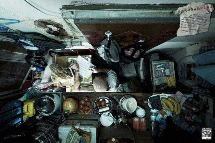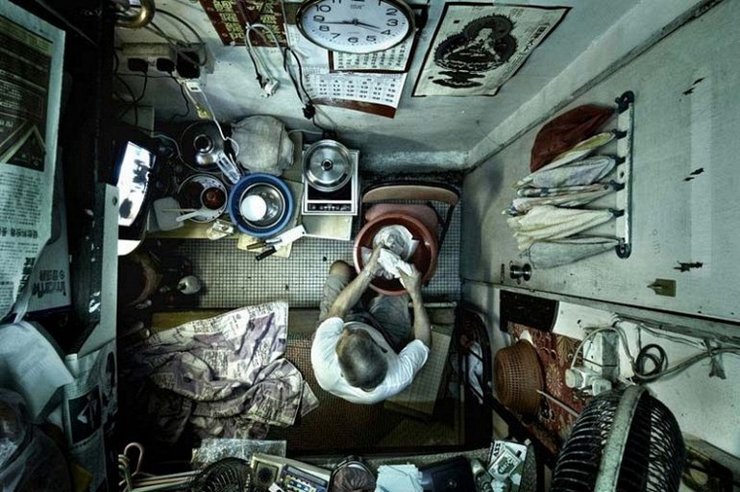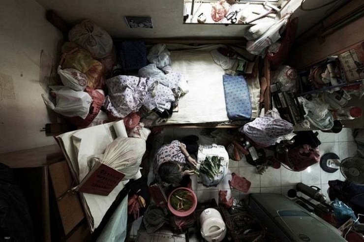 Немецкий фотограф Майкл Вулф показал в своей серии фотографий жилые кварталы Гонконга со стороны. Теперь же базирующаяся в Гонконге правозащитная организация — Society for Community Organization, показывает нам, как выглядят эти квартиры изнутри. Этот набор фотографий изображает прискорбные условия жизни одного из наиболее плотно населенных городов на земле с углом съемки сверху, который охватил всю комнату. Согласно статистике организации SoCO, более чем 100,000 человек в Гонконге не могут позволить себе нормальное жилье. Среди них пожилые люди и другие социально уязвимые группы, у которых нет выбора, кроме как жить в этих крошечных комнатах на 15 квадратных метров. В то время, как город кажется богатым, много людей все еще живут в недопустимых условиях. Люди проживют свою жизнь в этом ограниченном пространстве, спят в одном углу, готовят еду в другом, хранят своё имущество в одной трети, и в оставшемся пространстве смотрят телевизор.