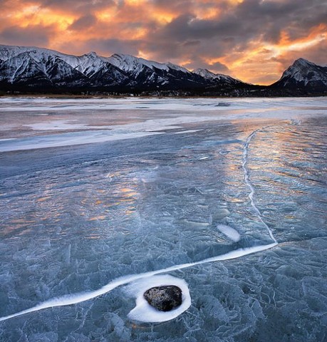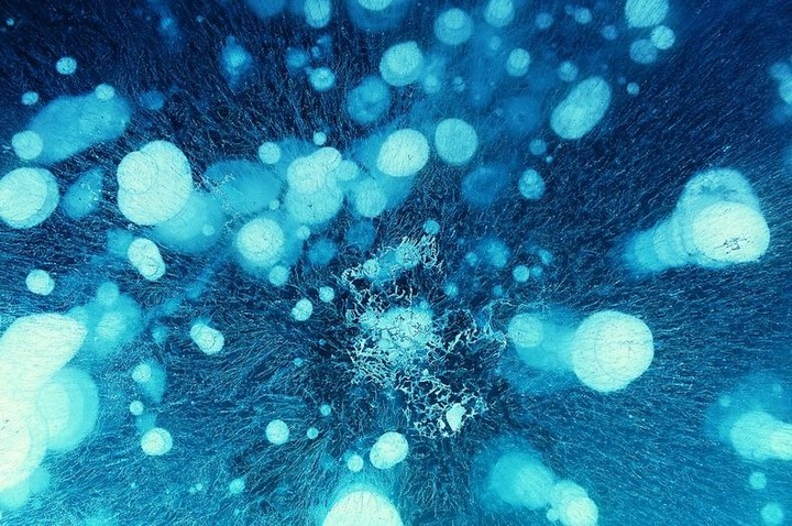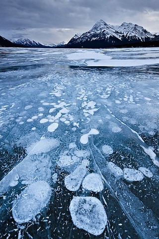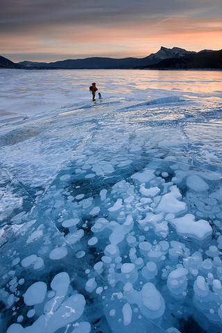 Потрясающее озеро Авраам находится в Альберте, Канада. Оно выглядит невероятно спокойно и живописно, не смотря на то, что нечто угрожающее и взрывоопасное скрывается под поверхностью. Четкие голубовато-белые элементы горючего газа-метана, напоминающие образования ваты – фактически заморожены в ледяной ловушке озера. Весной озеро оттаивает, пузырьки вырываются на свободу и поднимаются на вершину, после чего скрываются в атмосфере.