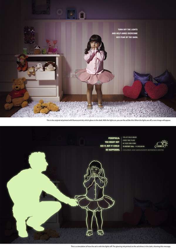 Такая сильная, продуманная и откровенная социальная кампания, которая ловит врасплох и сразу же заставляет задуматься. Эти Дети и все окружающее пространство напечатаны во флуоресцентных чернилах, чтобы казаться нормальными с ребенком, играющим или невинно лежащим в постели перед сном. Зритель, при этом, приглашен, чтобы “Выключить огни, и помощь (Энни / Питеру / Эмили) преодолеть его / ее страх перед темнотой”.