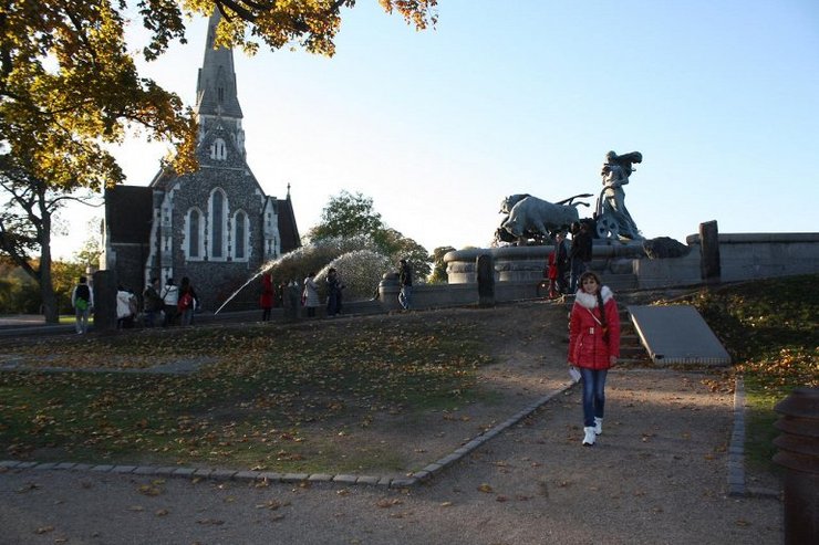 Мы прошлись по замечательному парку Черчилля здесь находиться красивейшая церковь Св. Албана, рядом знаменитый фонтан Гефионы. Согласно легенде король Швеции обещал отдать столько земли великолепной рассказчице Гефионе, сколько она сможет вспахать за одни сутки. А быки были волшебные и король был изумлен, когда увидел, на сколько много могла вскопать Гефиона. Но слово было дано и он отдал все земли, которые сейчас называются Данией.