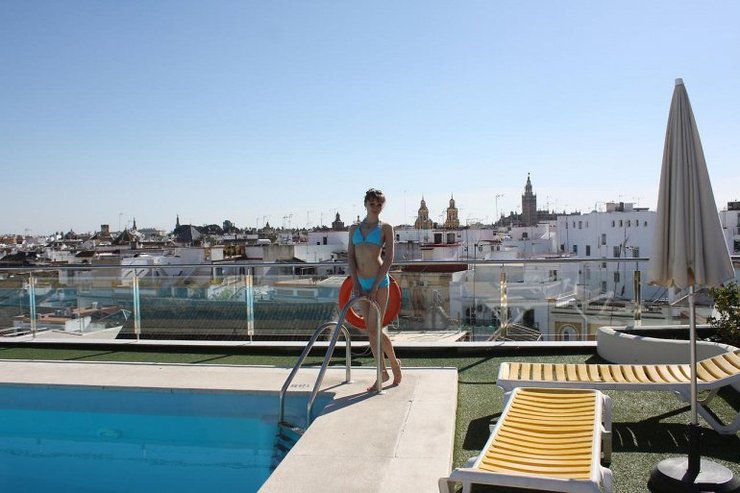 В Севилье было чрезвычайно жарко, повсюду пахло цветущими апельсинами. Мы добравшись до нашего замечательного отеля, который находился в центре города.Немного отдохнув, мы пошли на крышу отеля, где располагался бассейн. На крыше получаешь двойное наслаждение от купания в прохладном бассейне и от вида всех достопримечательностей .