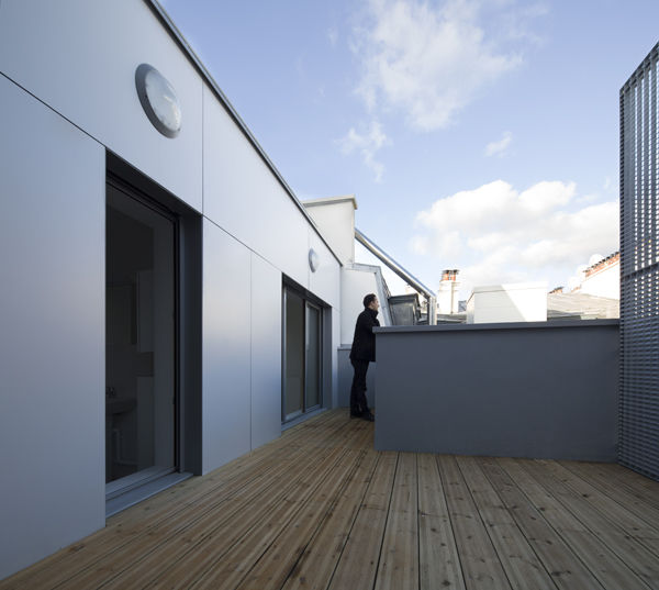 Архитектурно-дизайнерская группа MAAST создала отличительную трехстороннюю структуру с входом в основе, вдохновленную мансардой наклонную крышу и фасад с многочисленными отверстиями, сконцентрированные в середине. У семи этажей квартир есть окна, выходящие как на сад сзади, так и на улицу спереди, где выглядят особенно интригующе. Спеицальная белая оболочка использовалась, чтобы создать ставни, которые легко открываются и закрываются, регулирую степени непроницаемости и воздействия солнца.