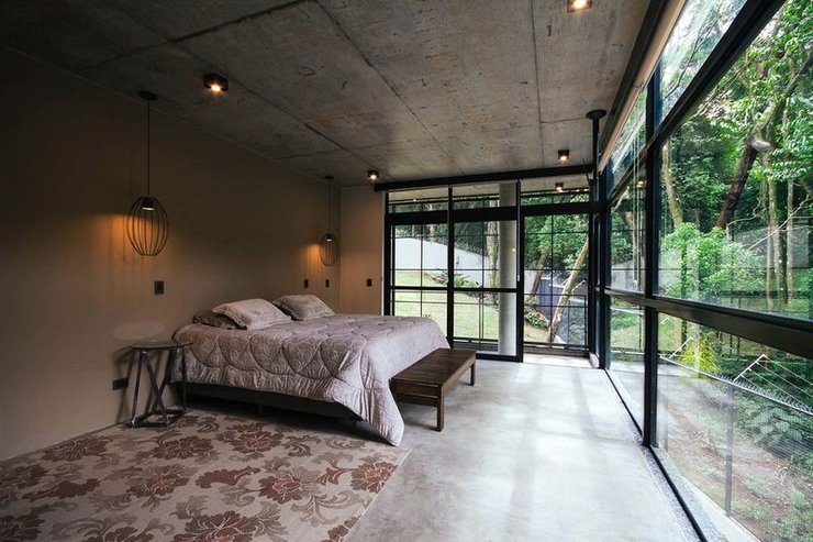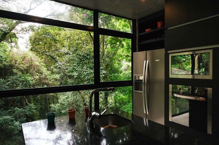 Архитекторы смогли добиться идеального баланса бетонной, стеклянной и стальной конструкции. JJO House открывает доступ к лесу из каждой комнаты. В результате создается впечатление, будто жилая площадь является неразрывным целым с окружающей её природой. В продолжение темы о гармоничной архитектуре почитайте о панорамном особняке в Намибии, где используется схожий подход.